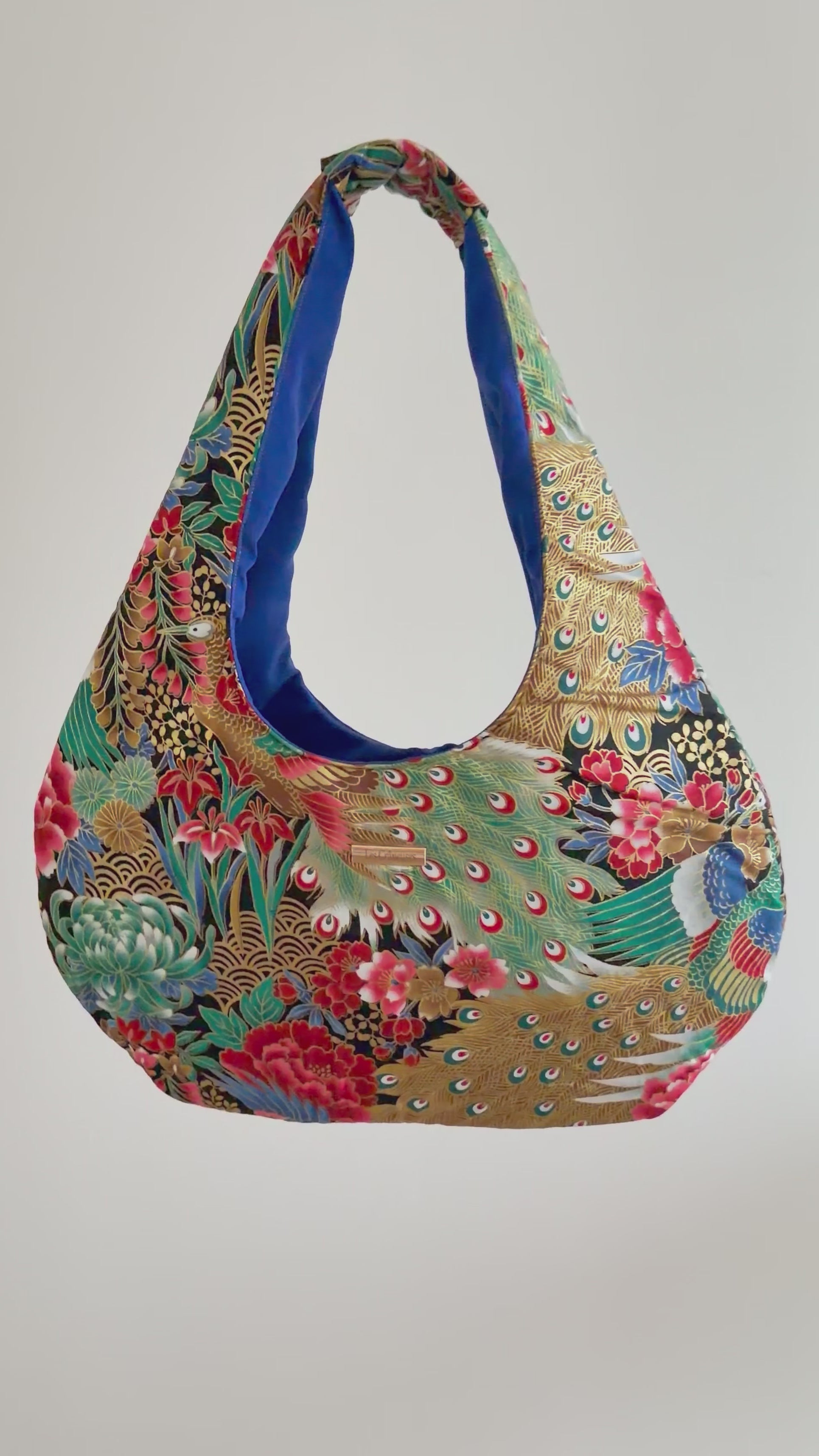 D’un côté, un tissu riche et vibrant, plein de détails dorés, de fleurs éclatantes et de plumes de paon sophistiquées.