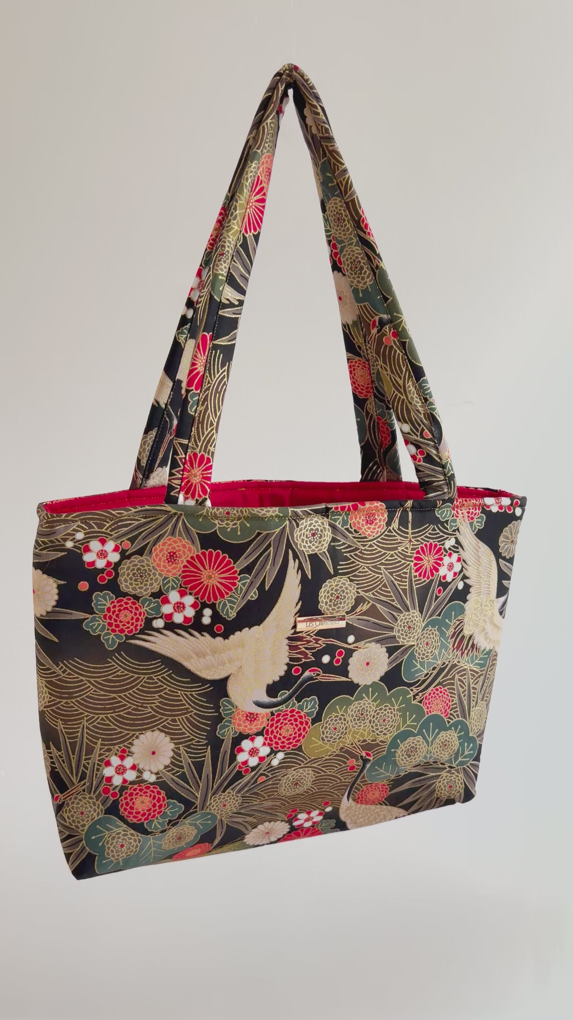Un tissu japonais noir, rouge et doré, délicatement orné d’oiseaux : élégant, raffiné et plein de caractère.